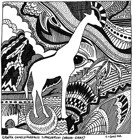A quiet giant of the savanna, sketched in ink. This doodle captures the elegant chaos of the Masai giraffe—its coat a mosaic of jagged...